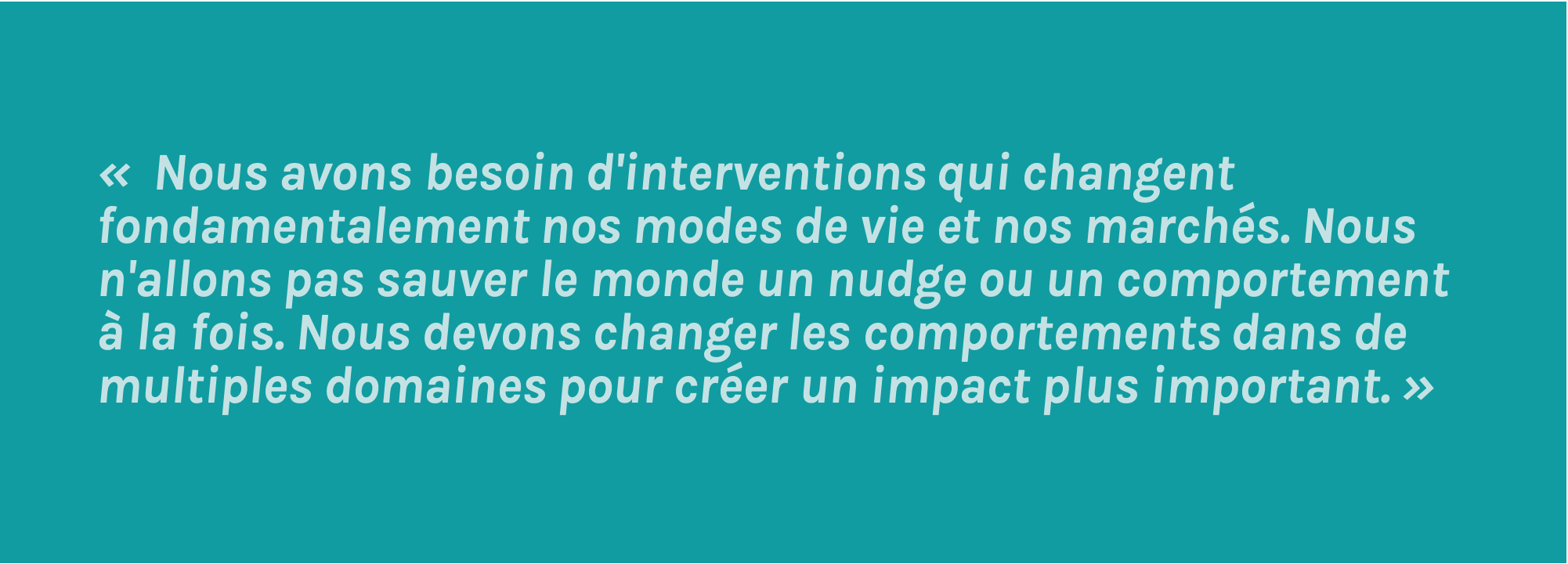 Nous avons besoin d'interventions qui changent fondamentalement nos modes de vie et nos marchés. Nous n'allons pas sauver le monde un nudge ou un comportement à la fois. Nous devons changer les comportements dans de multiples domaines pour créer un impact plus important.