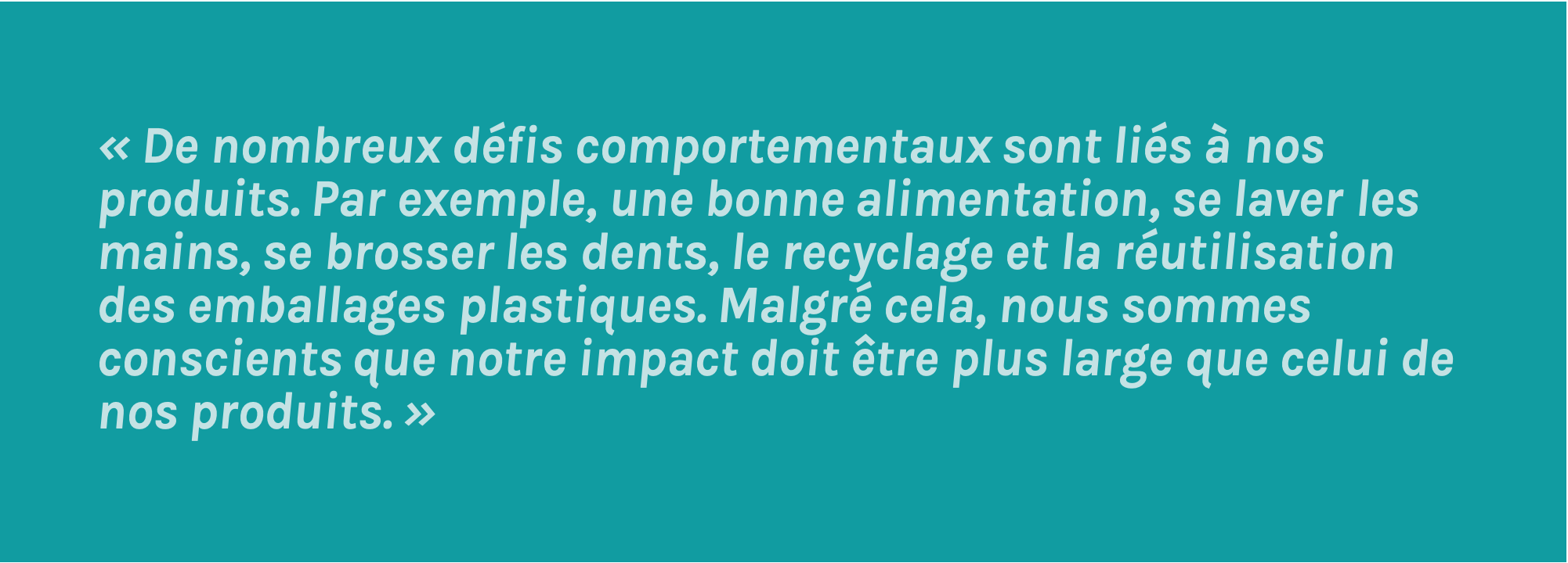 De nombreux défis comportementaux sont liés à nos produits. Par exemple, une bonne alimentation, se laver les mains, se brosser les dents, le recyclage et la réutilisation des emballages plastiques. Malgré cela, nous sommes conscients que notre impact doit être plus large que celui de nos produits.