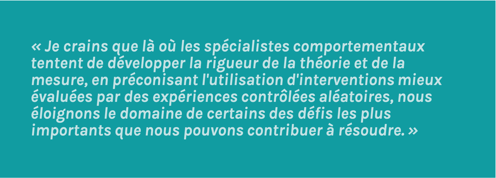 Je crains que là où les spécialistes comportementaux tentent de développer la rigueur de la théorie et de la mesure, en préconisant l'utilisation d'interventions mieux évaluées par des expériences contrôlées aléatoires, nous éloignons le domaine de certains des défis les plus importants que nous pouvons contribuer à résoudre.